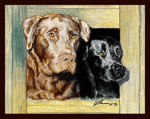 The "Loyal & Hardy" 12" X 16" tapestry placemat is from the Lynette Fransen collection and matches the tapestry afghan throw blanket. It portrays a black and chocolate lab. USA made, of acrylic and polyester.